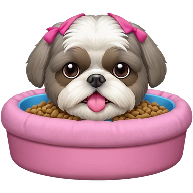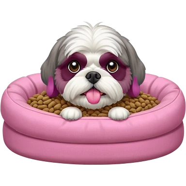 old ALL grey shih tzu in pink dog bed tongue hanging out near bowl of food emoji