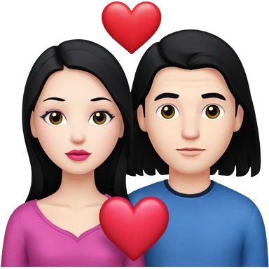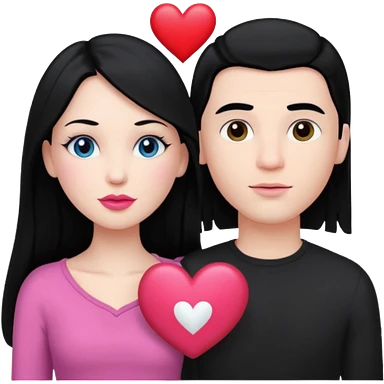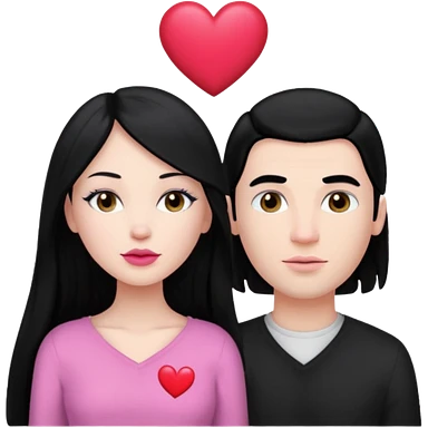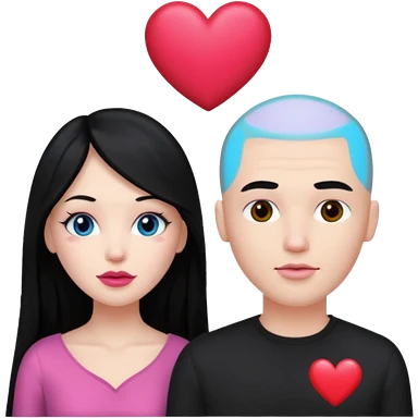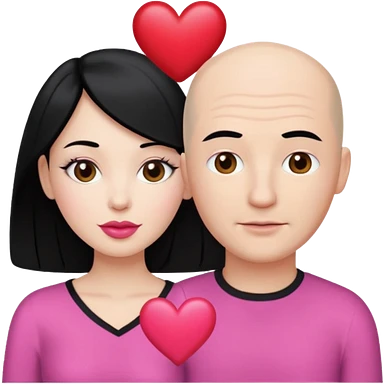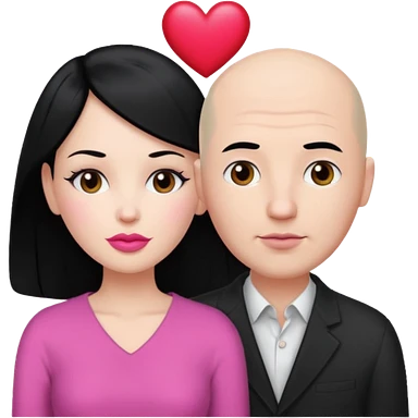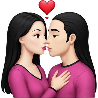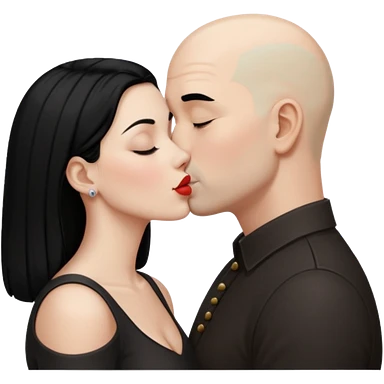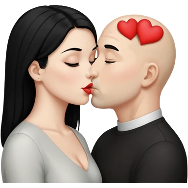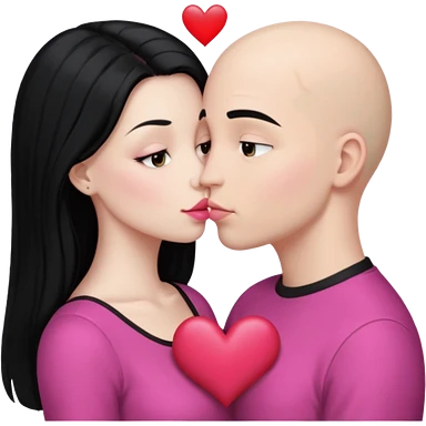 👩🏻❤️💋👨🏻 this one but the man should be bald. white woman with long black hair and white bald young man whoitiut hair and a heart between their heads. she has pink lips and both have brown eyes. he has e full beard but short. both wear black emoji