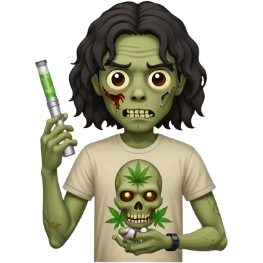 black mid long wavy haired zombie getting stoned with weed t shirt and bong on his hand emoji