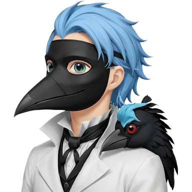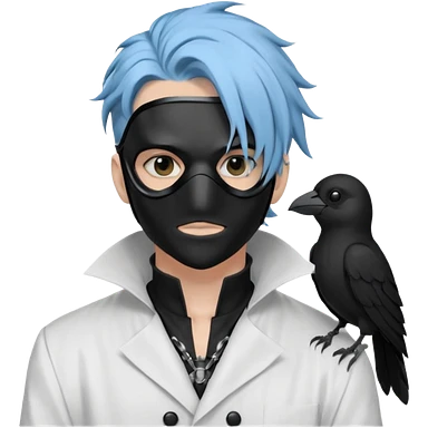 Handsome sexy adult anime man with light-blue hair and a black bird beak mask that covers whole face, black face mask, black mouth mask, black feathers draped over shoulder, wearing a white lab coat, long thin hair tendrils on the sides, with a mechanical raven sidekick emoji