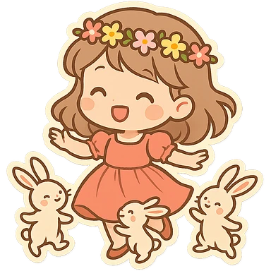 一个可爱的小女孩,穿着漂亮的裙子,头顶戴着花环,正在和几只小兔子跳舞 emoji | AI Emoji Generator