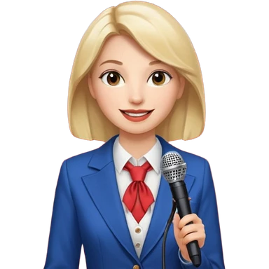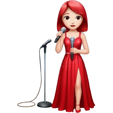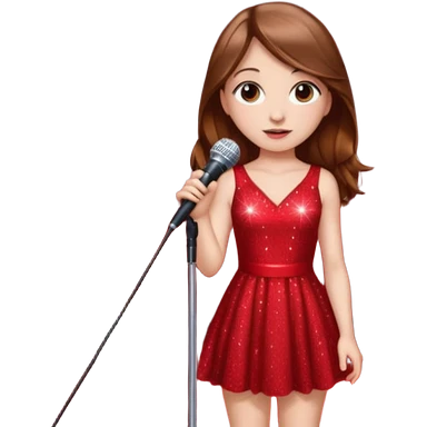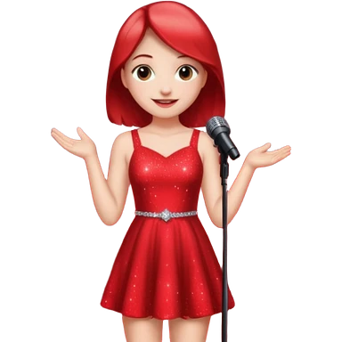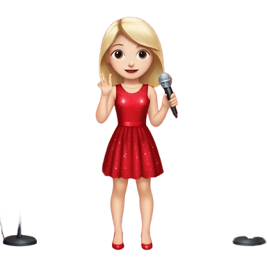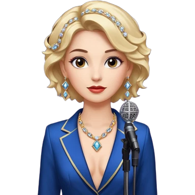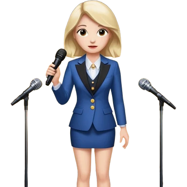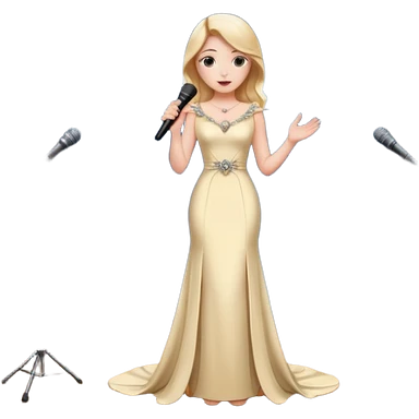 Девушка одета дорого, стоит на сцене. Рядом микрофон, свет софитов, камеры emoji