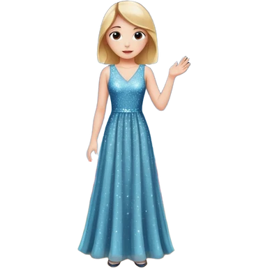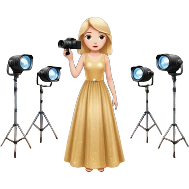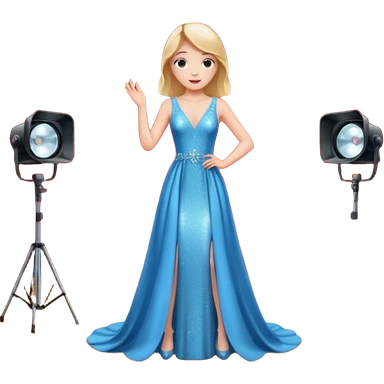 Девушка одета в дорогое платье , стоит на сцене. Рядом свет софитов, много камер, ее фотографируют emoji
