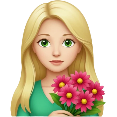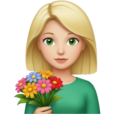 Long blonde haired woman with geen eyes holding a big bouquet of beautiful bright flowers emoji