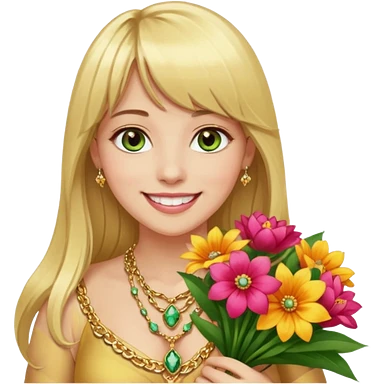 Long blonde haired with bangs, and big boobs smiling woman with hazel geen eyes, wearing gold gemstone chains, holding a big bouquet of beautiful bright flowers emoji