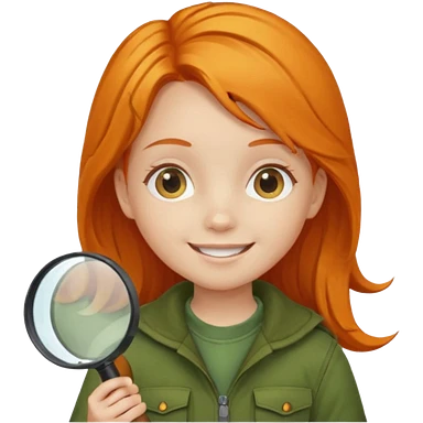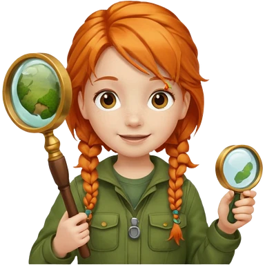braid orange haired girl kid in moss green explorer outfit, holding magnifying glass, smile emoji