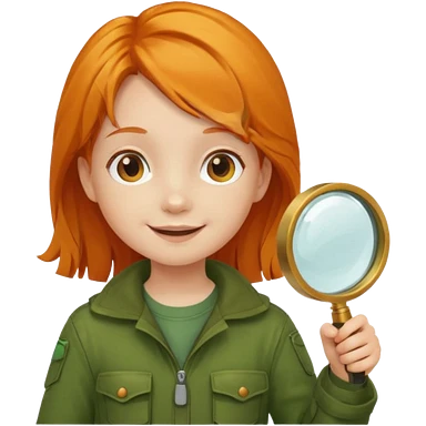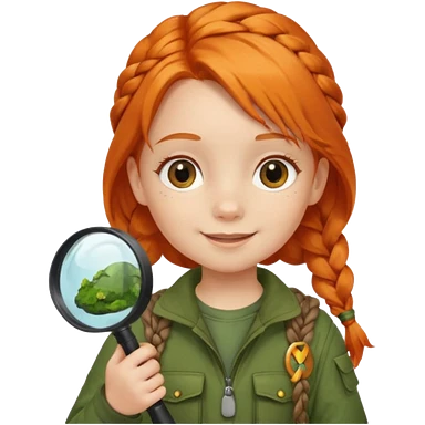 braid orange haired girl kid in moss green explorer outfit, holding magnifying glass emoji