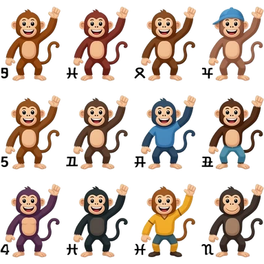 згенеруй мені 12 мавп, кожна різна, в різній позі, під кутом 45 градусів, в основному веселі, можуть використовувати різні атрибути, притаманні людям, але це мавпи, різного типу мавпи від орангутанга до шимпанзе кожна характеризує собою знак зодіаку emoji