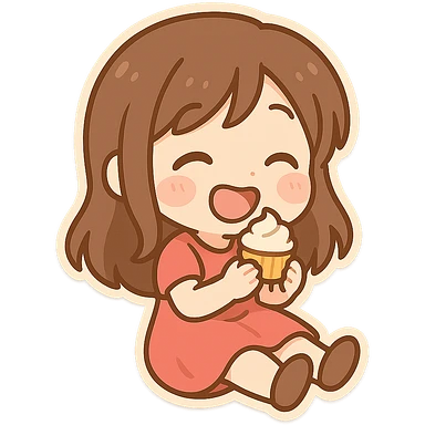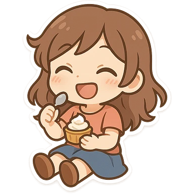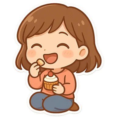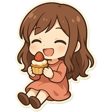 一个女孩开心地坐着,手里拿着一个小蛋糕,开心的吃着小蛋糕 emoji