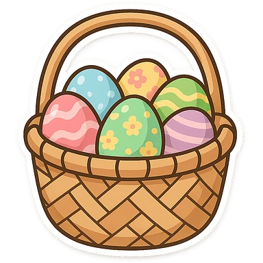 一个竹子编的篮子,篮子里面装着许多复活节的复活蛋 emoji
