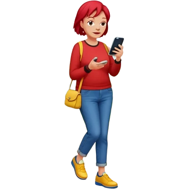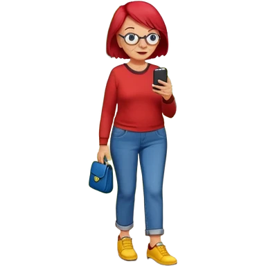 An old lady with red hair, wearing a red shirt, blue jeans, yellow shoes walking in a park holding a cell phone with a text bubble that says Have you checked in to the meetup? emoji