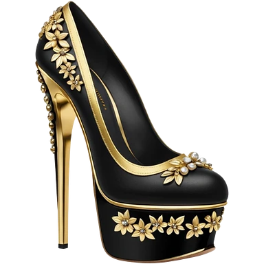 Alexander McQueen brand, black and gold high heel platforms, detailed embellishments. 8k, 5000x5000px, 3D rendering, realistic, isolated still life, no emoji faces no emoji icons no human figures emoji