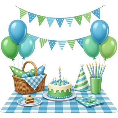 green blue Picnic-style birthday setup decorations, transparent background inspired by barbie colour pallete emoji