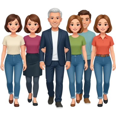 Group of 40yo friends whose passion is going for walks. All have short hair and one has white hair. iOS emoji style emoji
