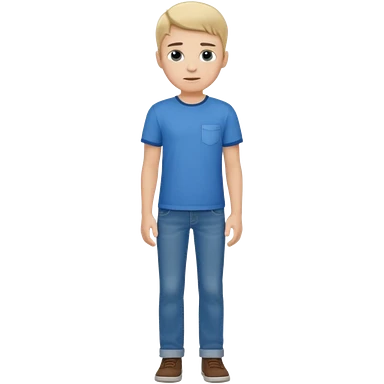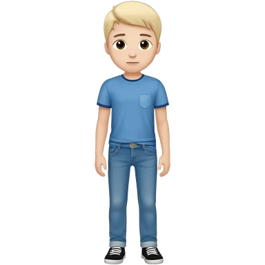Мальчик стоит на фоне стены в полнуй рост с грустным выражением лица в синей футболке и серых шатнах. emoji