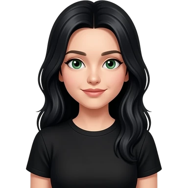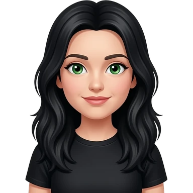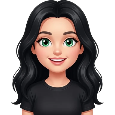 long black hair green eyes wearing black T-shirt, bright face emoji
