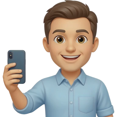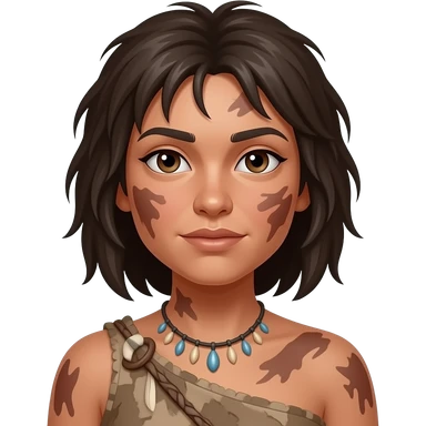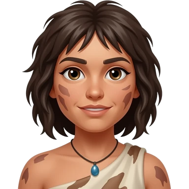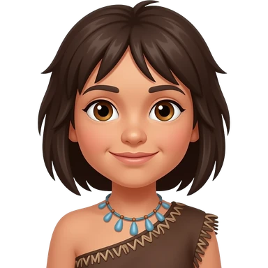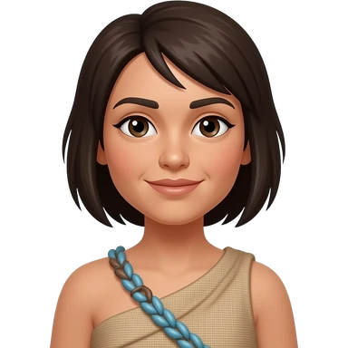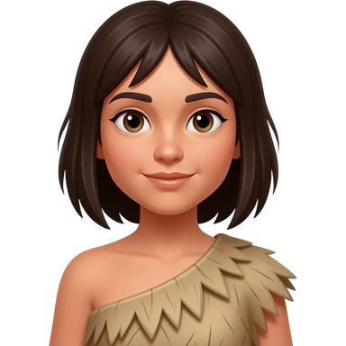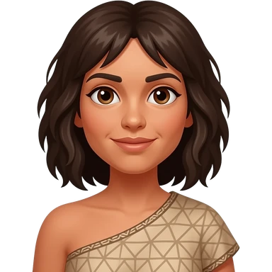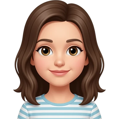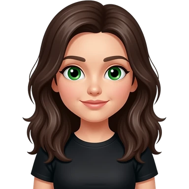 bright green eyes, long dark brown hair with layers, black T-shirt emoji
