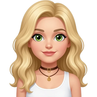 bright green eyes, long blonde hair with slightly wavy and layers, brown necklace, white top emoji