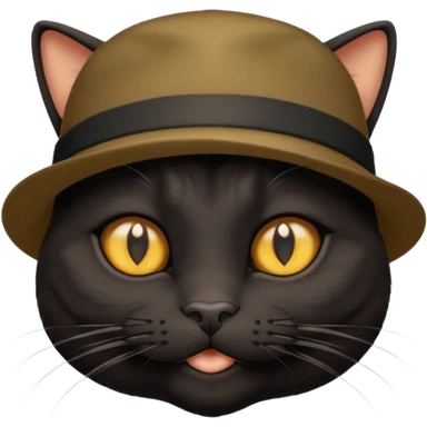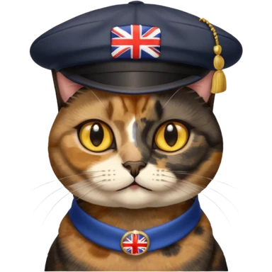 mostly black tortie cat, gold eyes, british hat emoji