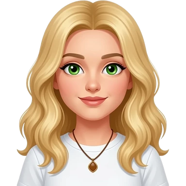 long blonde a little curl hair green eyes wearing white T-shirt, brown necklace emoji
