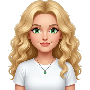 long blonde curl hair green eyes wearing white T-shirt, necklace emoji