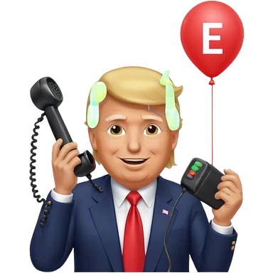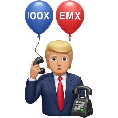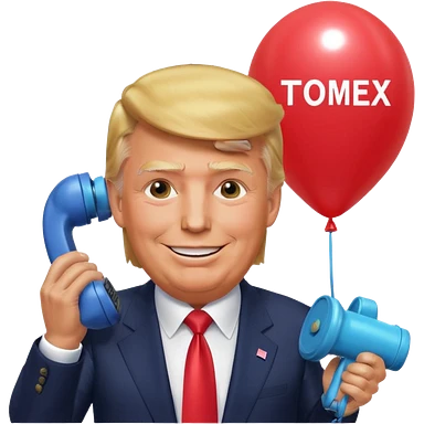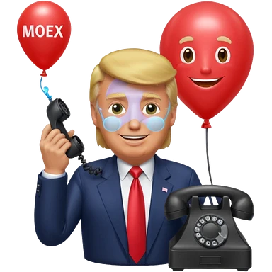Дональд Трамп улыбается в поте лица качает через насос в виде телефонного аппарата, который подключен к шарику, который символизирует фондовый рынок и на нём написано IMOEX emoji