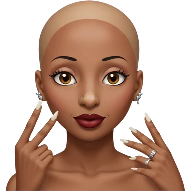 Grown black (proud) woman, bald with a perfect head, a prominent nose with a septum piercing, many piercings on her ears, a gap between her front teeth and very long nails (cynthia erivo) emoji