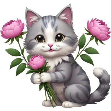 Cute cat Handing pink peonies like reaching a hand and handing them out a bouquet of them not a physical hand the cats hand make the cat fluffy and grey and white emoji