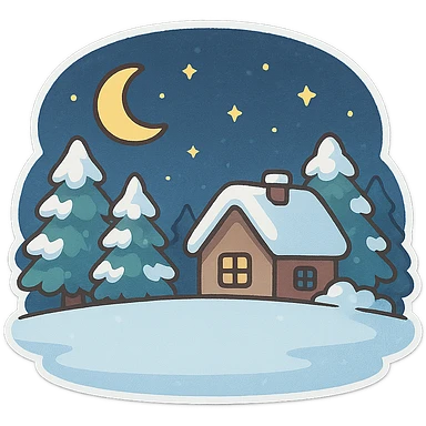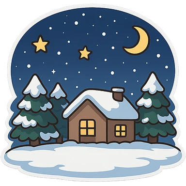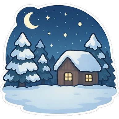 一张冬天雪里的场景,背景有堆满雪的松树和房屋,前面是一块空地,天空是夜晚的星空,有星星和月亮 emoji