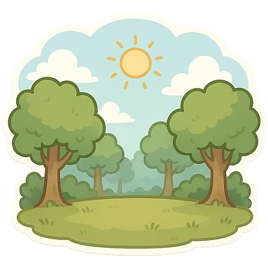 一张森林场景,中间是一片空地,蓝色天白云,太阳 emoji