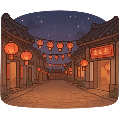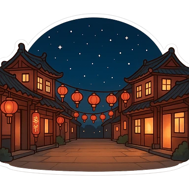 一条漂亮的中国街道,春节气息,中间有一片空地,夜晚,星空 emoji