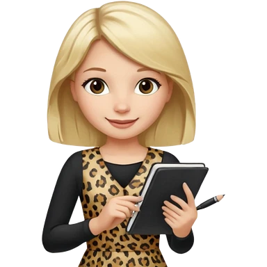 Blond hair girl with a leopard print dress and black leggings smiling holding a note book and a pen emoji