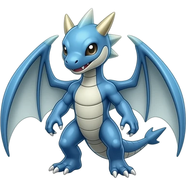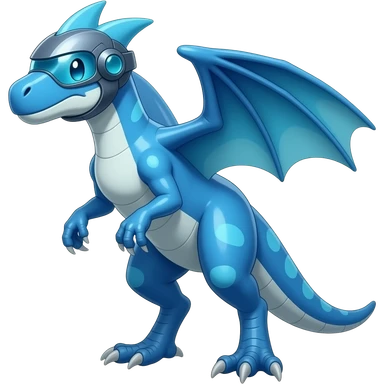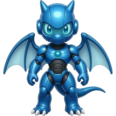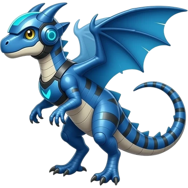 a shiny blue Genesect-Flygon-Raptor-Fakémon—hybrid with a futuristic visor-helmet full body emoji