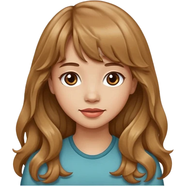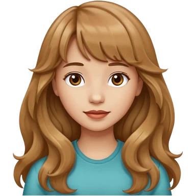 Please generate a portrait of a pretty girl with long, wavy, light brown hair and bangs. emoji