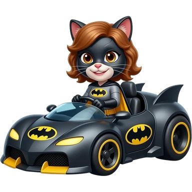 mulher gato com cabelos e olhos castanhos sorrindo dirigindo o carro batmóvel emoji