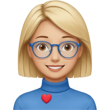 Asthectic pretty Blonde women brown eyes, blue glasses, wearing a brown polo neck shirt and smiling with a pink heart around her. emoji