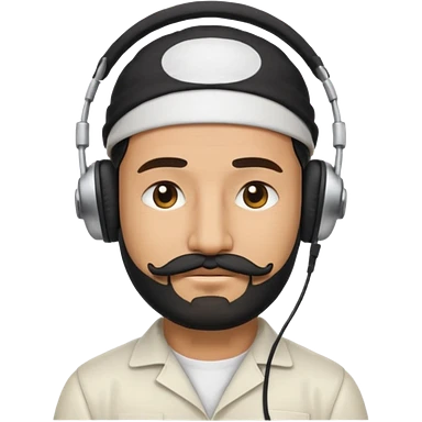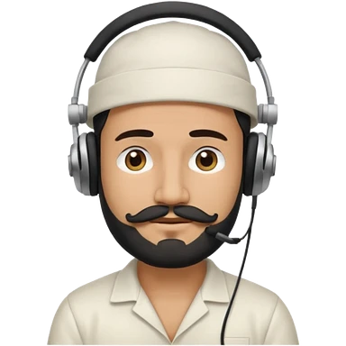 Half body man wearing white topi, lapray, black beard and moustache, headphones, eyes closed, realistic emoji style. emoji