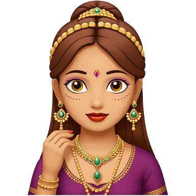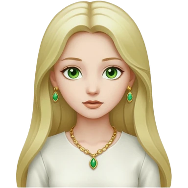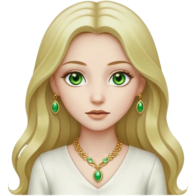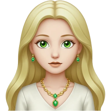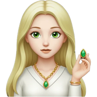 girl with very pale skin, green eyes, long dark blonde hair, white outfit, gold jewelry emoji