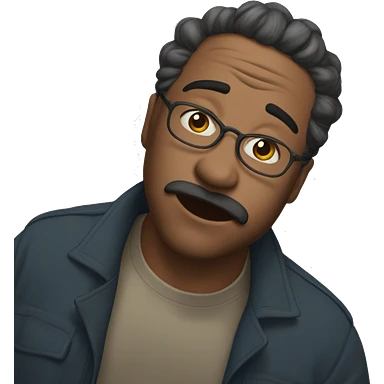 검은 금장로브, 로브의 후드를 뒤집어 쓴, 10대 미소년, 다크 브라운 피부, 체리 레드 선글라스, 선글라스에 안광, 청록색으로 반짝이는 푸른 구슬, 활짝 웃는 표정, emoji