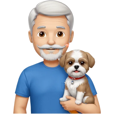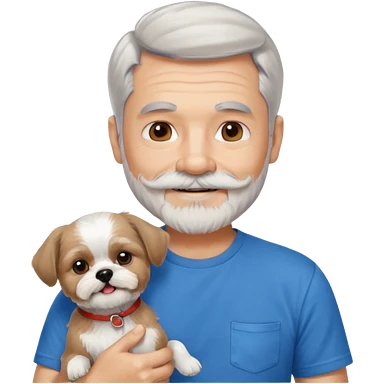 handsome gentleman, 60 years old, short silver hair, beard/moustache, wearing a blue t-shirt, smiling and holding a shih tzu emoji