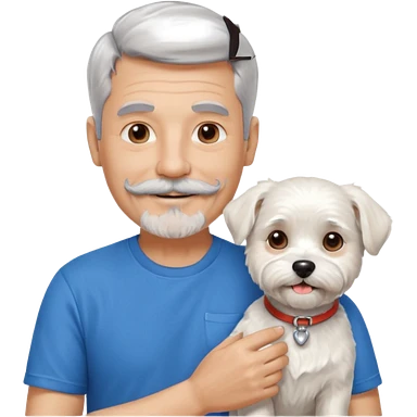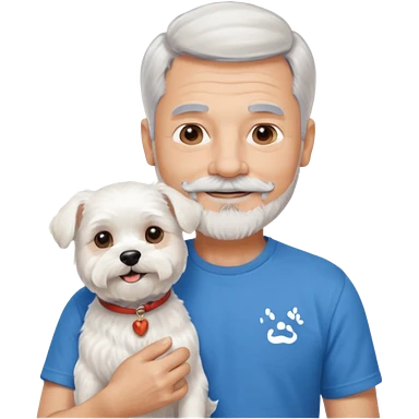 handsome gentleman, 60 years old, short silver hair, beard and moustache, wearing a blue t-shirt, smiling and holding a maltese dog emoji