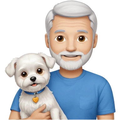 handsome gentleman, 60 years old, silver hair in crew cut style, full beard, wearing a blue t-shirt, smiling and holding a maltese dog emoji