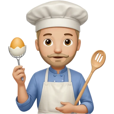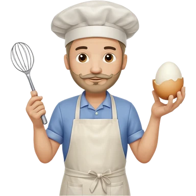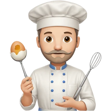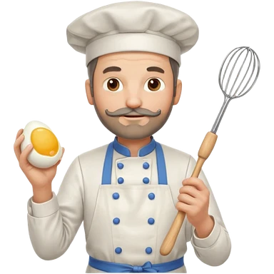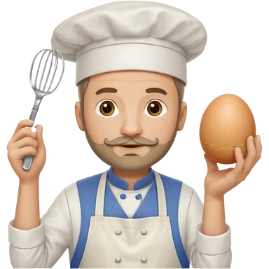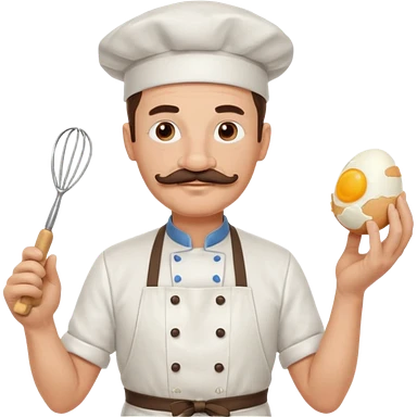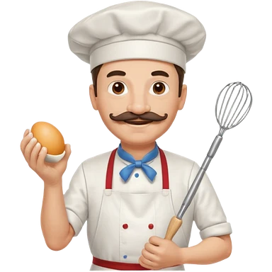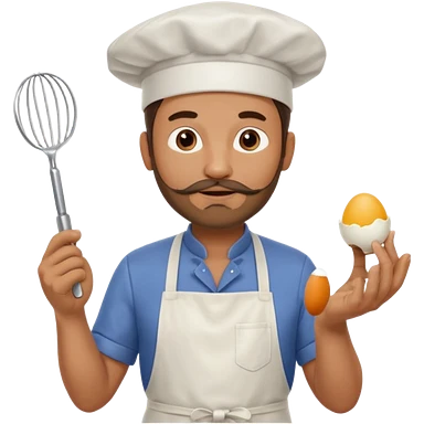 Middle aged male pastry chef - with a mustache, apron, white hat, and holding an egg beater in one hand emoji