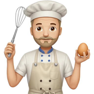 Middle aged male pastry chef - with a small beard, apron, white hat, holding an egg beater in his right hand, and his left hand naturally hanging down to his side emoji