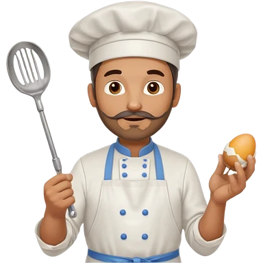 Middle aged male pastry chef - with a small beard, apron, white hat, holding an egg beater in one hand and naturally drooping in the other hand emoji
