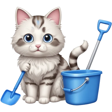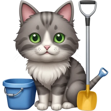 A very cute cat holding a toilet shovel, a litter box beside it emoji