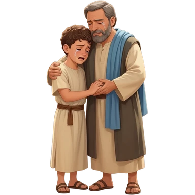 нарисуй как отец со слезами обнимет с любовью и слезами сына возростом 20-24 года во весь рост , времена древнего иерусалима emoji