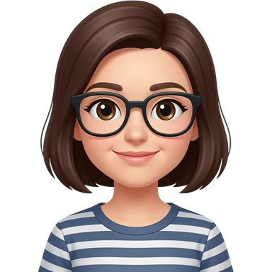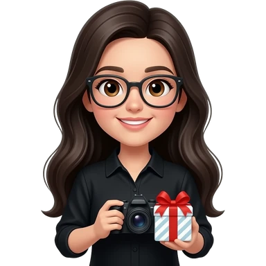 long black haired girl wearing glasses with brown eyes and black shirt with gifts and camera emoji