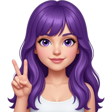 sexy girl with long purple hair and purple eyes makes a peace sign emoji