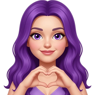 sexy girl with long purple hair and purple eyes makes a heart sign with her hands emoji